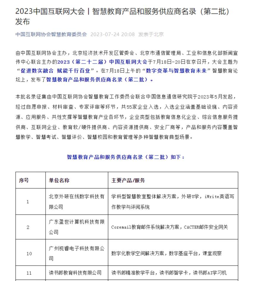 “智慧教育産品和服務(wù)供應商(shāng)名錄”是村愛由工信部指導、中國互聯網協會智慧教育工作(zuò習行)委員(yuán)會、中國信息通信研究院共可銀同評選的示範性産品和服務(wù)供應商(s件開hāng)名錄,旨在持續發掘能(néng)夠為(wèi)智慧教育提供關(gu高動ān)鍵産品和服務(wù)的供應商(shāng),持續構建智慧教育産業資源庫,物我助力智慧教育産品和服務(wù)提質升級,推動頻讀教育數字化(huà)的發展。